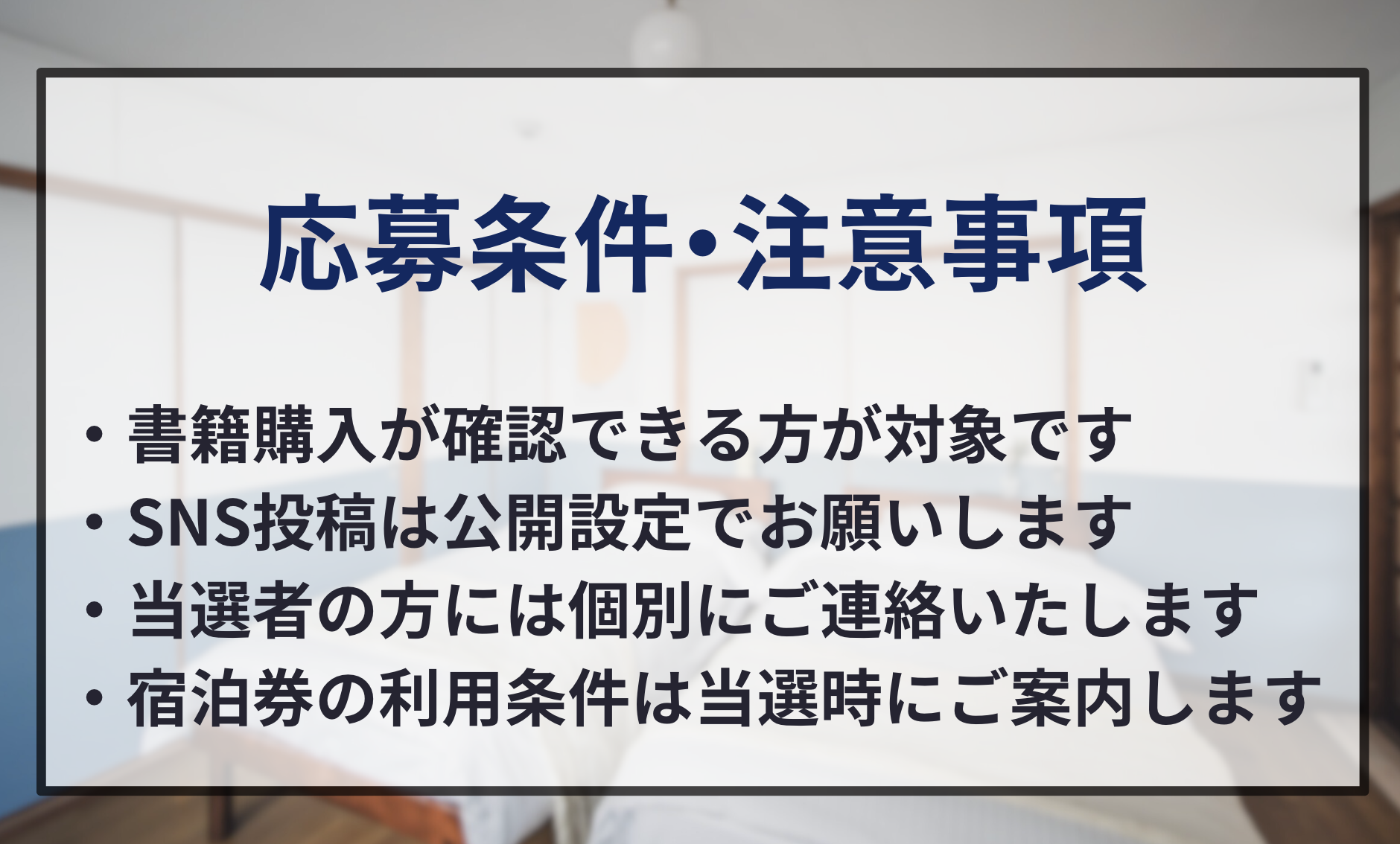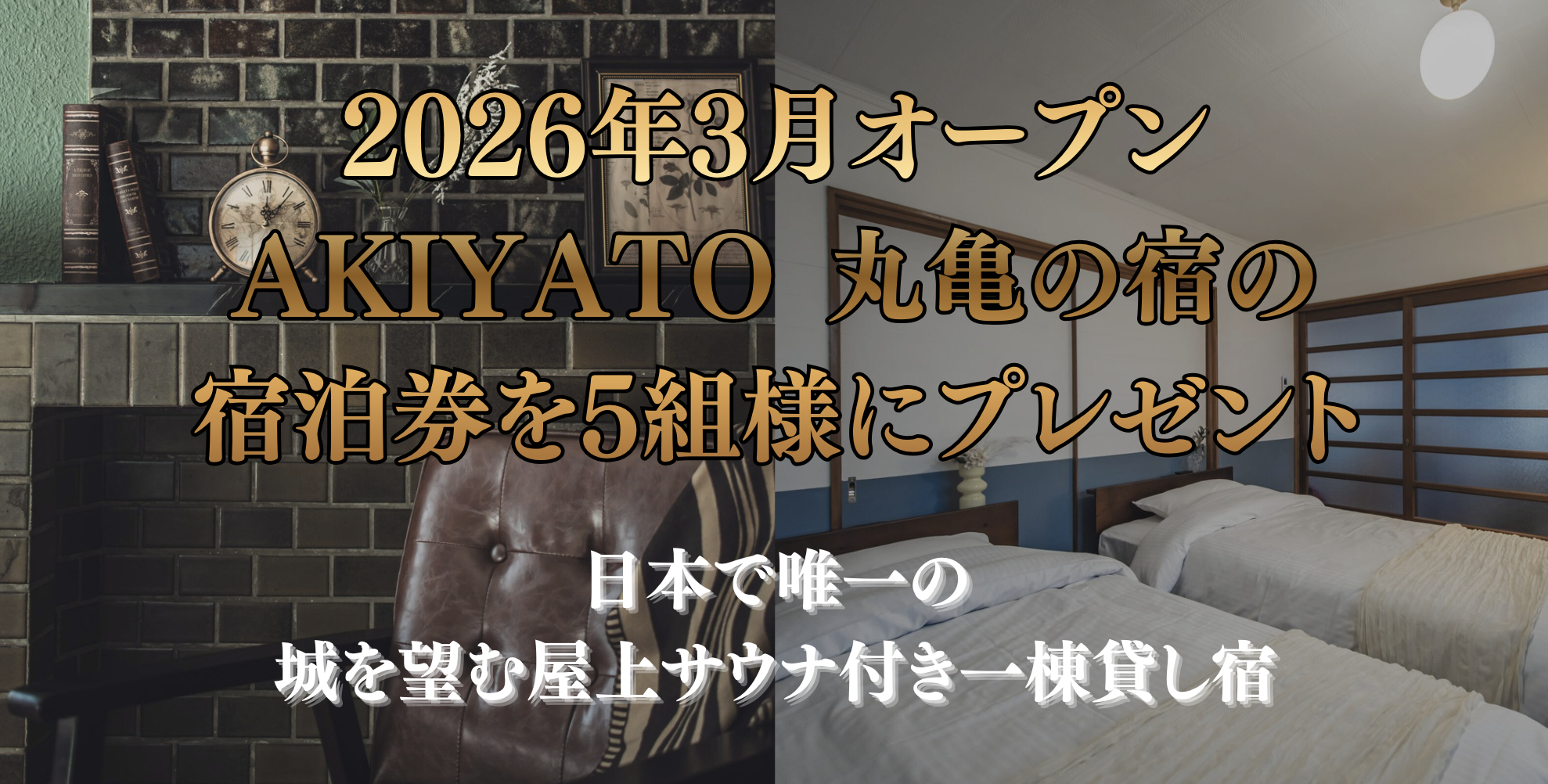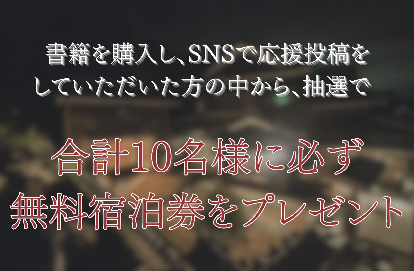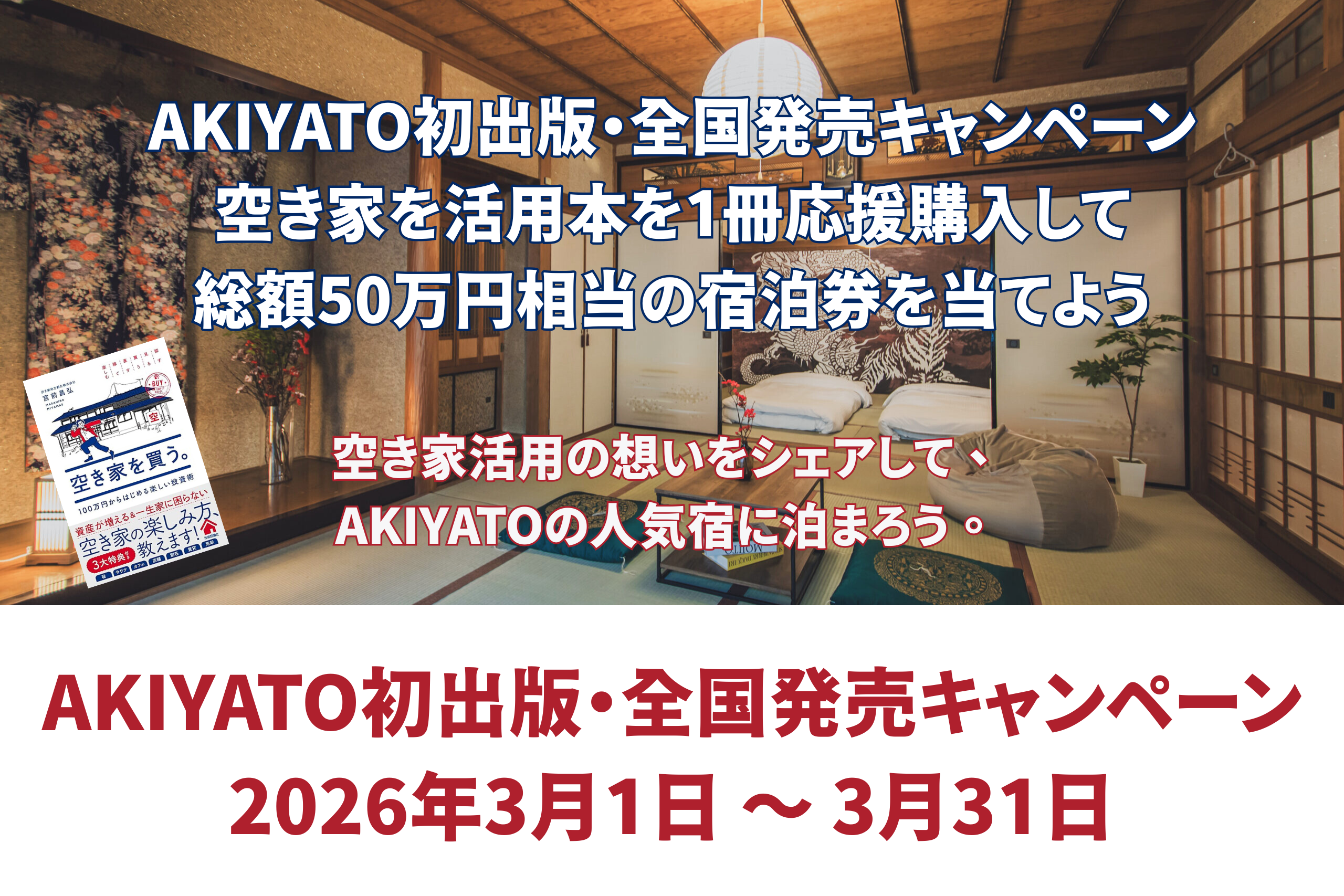 当社初となる書籍の出版を記念し、2026年3月1日(日)から3月31日(火)23時59分までの期間、抽選で必ず10組様に、当社が運営する人気の一棟貸し宿の宿泊券が当たるプレゼントキャンペーンを実施します。